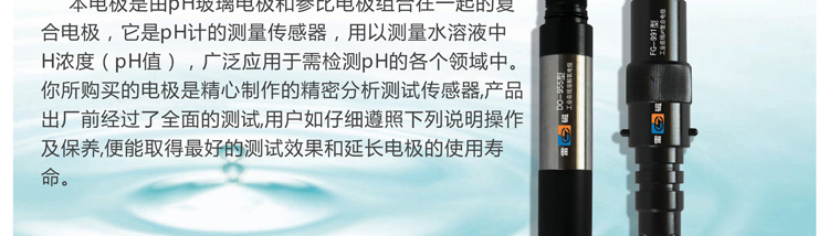 pH電極,是ph計上與被測溶液接觸的部分,用來測電極電位值的裝置。電位分析法所用的電極被稱為原電池。原電池是一個系統,它的作用是使化學反應能量轉成為電能,此電池的電壓被稱為電動勢。此電動勢由二個半電池構成。其中一個半電池稱作測量電極,它的電位與特定的離子活度有關;另一個半電池為參比半電池,通常稱作參比電極,它一般與測量溶液相通,并且與測量儀表相連。pH復合電極是將pH指示電極和參比電極組合在一起的電極,根據外殼材料的不同可分為塑殼和玻璃兩種。相對指示電極而言,復合電極使用比較方便。