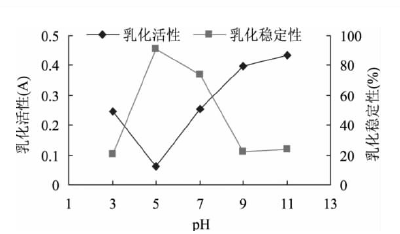 [9]等人研究鷹嘴豆分離蛋白乳化性時,采用不同pH值梯度對其進行測定。pH值范圍選定為3、5、7、9、11,分別測量在不同pH處理過后的蛋白的乳化活性和乳化穩定性。結果如下: