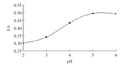 [5]等人在研究大豆乳化性質的課題中,采用不同梯度的pH值對大豆蛋白粉進行處理,加熱溫度為60℃下,采用1mol/L的鹽酸調節大豆蛋白溶液的pH,范圍為2.0-6.0,處理30min,測定其乳化性。結果如圖: